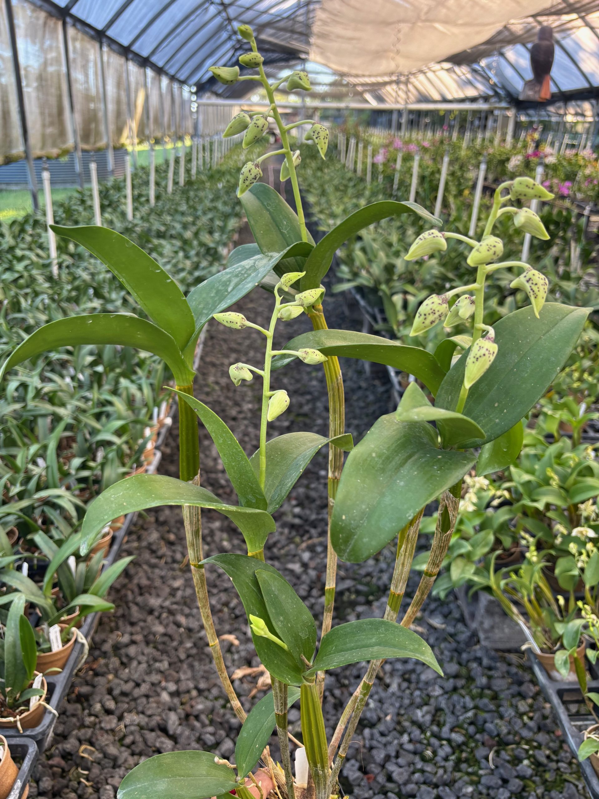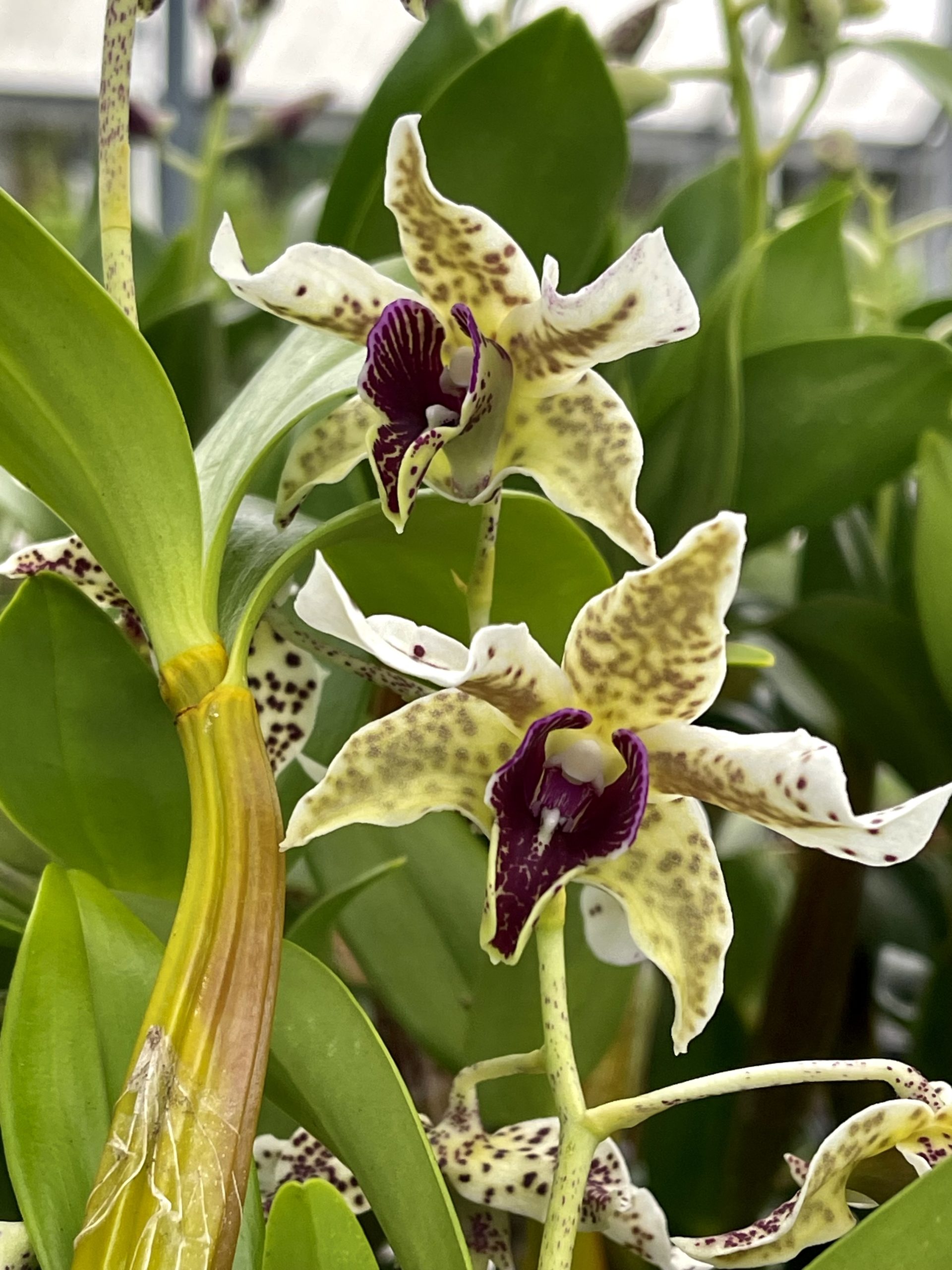 Den. Spotted Poni – (Den. Roy Tokunaga x Little Atro). The season for this fantastic Latouria hybrid is kicking off, and we’re harvesting mature plants in 4″ pots with over four spikes each. These long-lasting beauties are bound to impress.